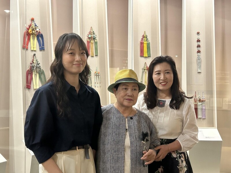 | ▲ 특별전 '매듭'을 준비한 관계자들 (서울=연합뉴스) 김예나 기자 = 5일 서울 종로구 국립민속박물관에서 열린 기증 특별전 '매듭' 전시장에서 만난 관계자들. 왼쪽부터 이주홍 학예연구사, 매듭공예가 이부자 씨, 최은수 학예연구관. 2023.9.5 yes@yna.co.kr |