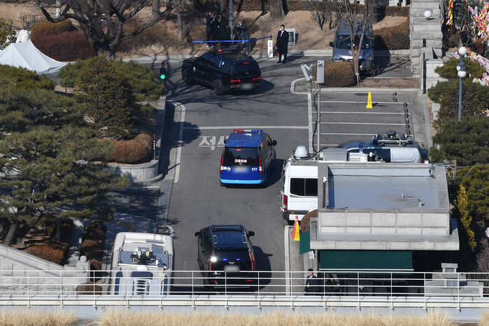 A Ministry of Justice vehicle (C) carrying arrested President Yoon Suk Yeol drives into the Constitutional Court in Seoul on Jan. 23, 2025, as Yoon will attend the fourth hearing of his impeachment trial for his short-lived imposition of martial law in December. (Yonhap)