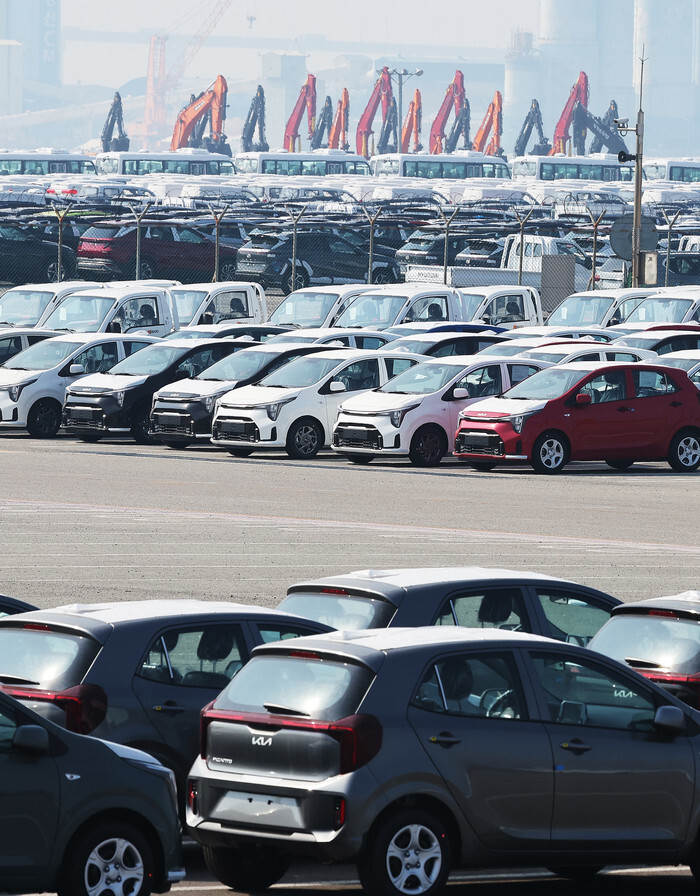 Cars for export pack a port in Pyeongtaek, south of Seoul, on April 1, 2025. South Korean industries are staying vigilant over a wave of U.S. tariffs set to take effect this week, fueling concerns over the potential impact on the country's export-driven economy. (Yonhap)