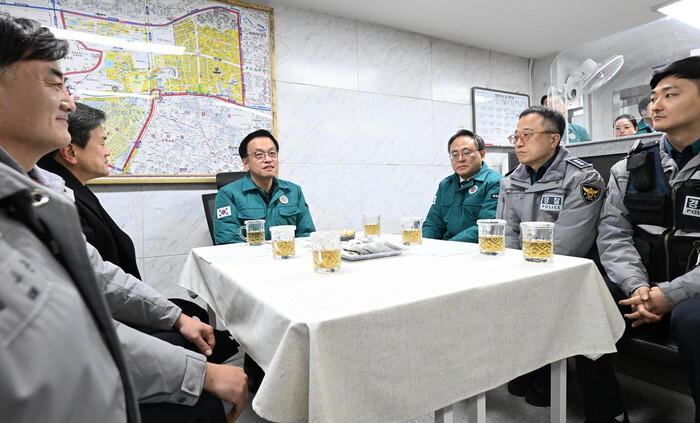 Acting President Choi Sang-mok (C), who serves concurrently as deputy prime minister for economic affairs and finance minister, meets with a group of police officers during a visit to a police outpost in Seoul on Jan. 27, 2025, as many people travel home on a six-day break for Lunar New Year, known as Seol, which falls on Jan. 29 this year, in this photo released by the finance ministry. (PHOTO NOT FOR SALE) (Yonhap)