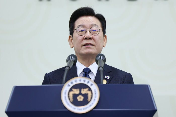 President Lee Jae Myung holds a press conference in the southeastern city of Gyeongju on Nov. 1, 2025, following the Asia-Pacific Economic Cooperation summit. (Yonhap)