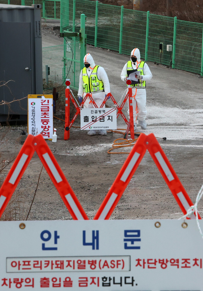 Quarantine workers control access to a farm in Gangneung, about 170 kilometers east of Seoul in Gangwon Province, where the nation's first case of African swine fever in about two months was confirmed, on Jan. 17, 2026. (Yonhap)