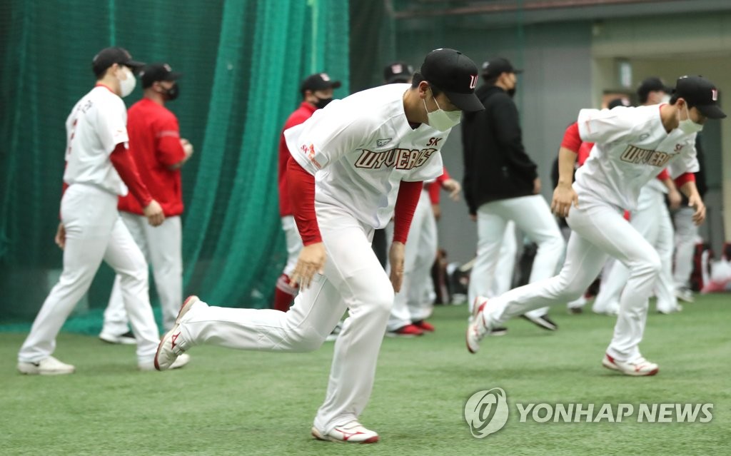 | ▲ In this file photo from Feb. 1, 2021, members of the SK Wyverns train at Kang Chang-hak Stadium in Seogwipo, Jeju Island, during spring training. (Yonhap) |