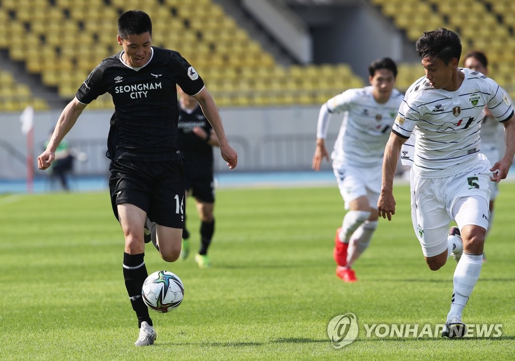 | ▲ In this file photo from June 6, 2021, Lee Jong-sung of Seongnam FC (L) tries to dribble past Paik Seung-ho of Jeonbuk Hyundai Motors during a K League 1 match at Tancheon Sports Complex in Seongnam, Gyeonggi Province. (Yonhap) |