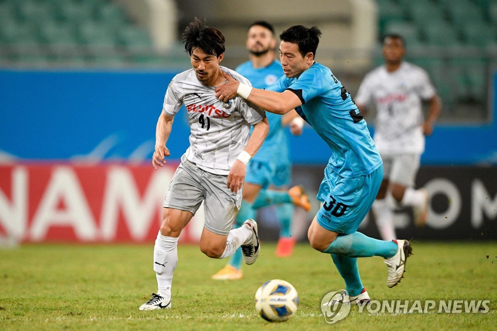 | ▲ Park Byung-hyun of Daegu FC (R) and Akihiro Ienaga of Kawasaki Frontale battle for the ball during the clubs' Group I match at the Asian Football Confederation (AFC) Champions League at Bunyodkor Stadium in Tashkent on July 8, 2021, in this photo provided by the AFC via AFP. (PHOTO NOT FOR SALE) (Yonhap) |