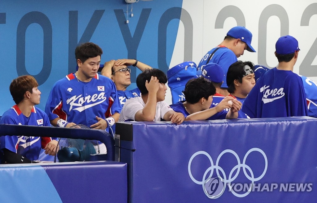 | ▲ South Korean players react to their 7-2 loss to the United States in the teams' semifinal game of the Tokyo Olympic baseball tournament at Yokohama Stadium in Yokohama, Japan, on Aug. 5, 2021. (Yonhap) |