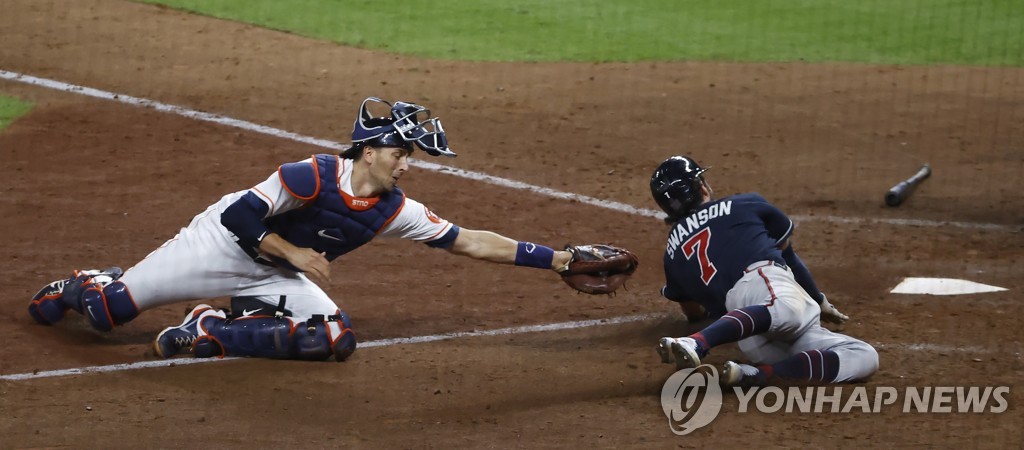 | ▲ 포수 태그 피해 쐐기를 박는 애틀랜타 스완슨 [EPA=연합뉴스] |