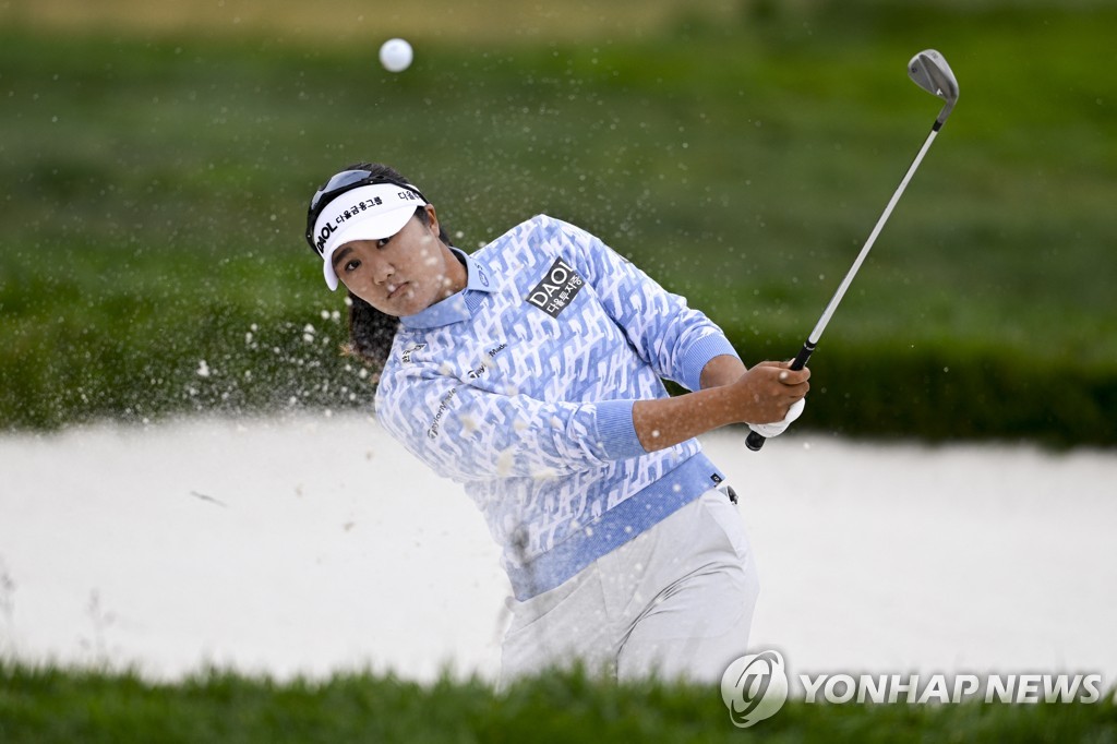 | ▲ In this USA Today Sports photo via Reuters, Ryu Hae-ran of South Korea hits out of a bunker on the 13th hole during the second round of the U.S. Women's Open at Pebble Beach Golf Links in Pebble Beach, California, on July 7, 2023. (Yonhap) |