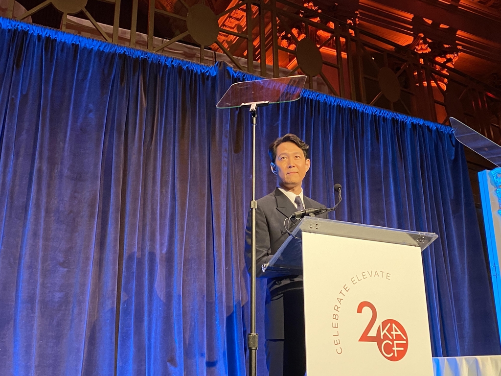 이정재는 이날 밤 미국 뉴욕시 치프리아니 월스트리트에서 열린 한인커뮤니티재단(KACF) 창립 20주년 연례 만찬에서 공로상 수상 소감을 통해 "'오징어 게임'에서 기훈이라는 캐릭터를 연기하면서 가슴이 많이 아팠다"며 이같이 밝혔다.