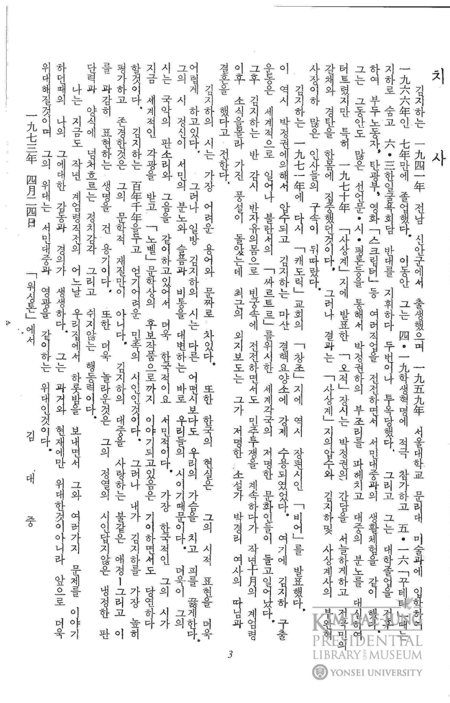 사료에는 1973년 4월 미국에서 발간된 김지하 시인의 시집 표지와 시집에 수록된 김 전 대통령의 추천사도 포함됐다.