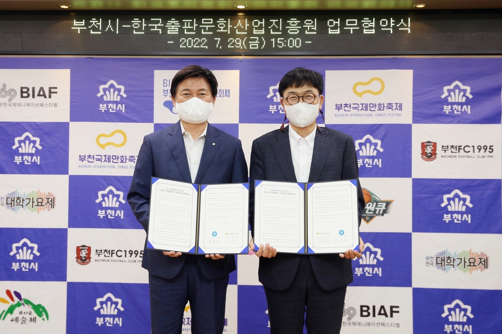 ▲ 한국출판문화산업진흥원과 경기 부천시는 '2022년 책문화센터 구축 및 운영' 공모사업 선정에 따라 업무협약을 체결했다. 양측은 부천 책문화센터(꿈빛도서관 3층 리모델링) 조성, 센터 조성 후 독서문화 프로그램 운영, 지역 출판 및 독서문화 활성화 등을 위해 협력할 계획이다. (서울=연합뉴스)