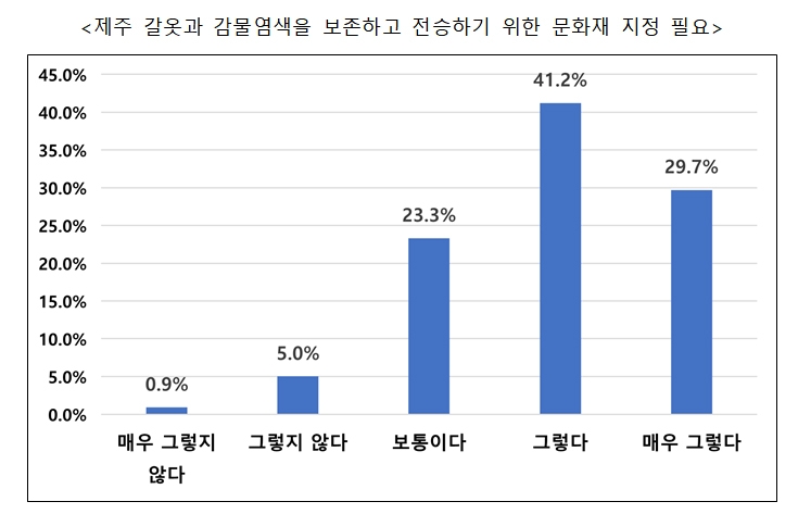 설문조사에서 '제주 갈옷과 감물염색을 보존하고 전승하기 위해 문화재로 지정할 만한 가치가 있다고 생각하는지'에 대한 질문에 '그렇다'가 191명(41.2%), '매우 그렇다'가 138명(29.7%)으로 응답자 464명 중 329명인 70.9%가 긍정적인 답변을 했다.