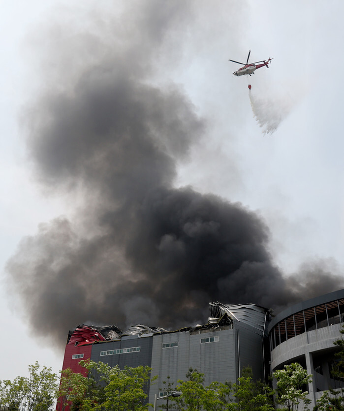 A firefighting helicopter pours water on a logistics warehouse engulfed in black smoke after a fire broke out at the facility in the city of Icheon, southeast of Seoul, on May 13, 2025. More than 100 people were evacuated from the warehouse, and there were no casualties from the blaze, firefighters said. (Yonhap)