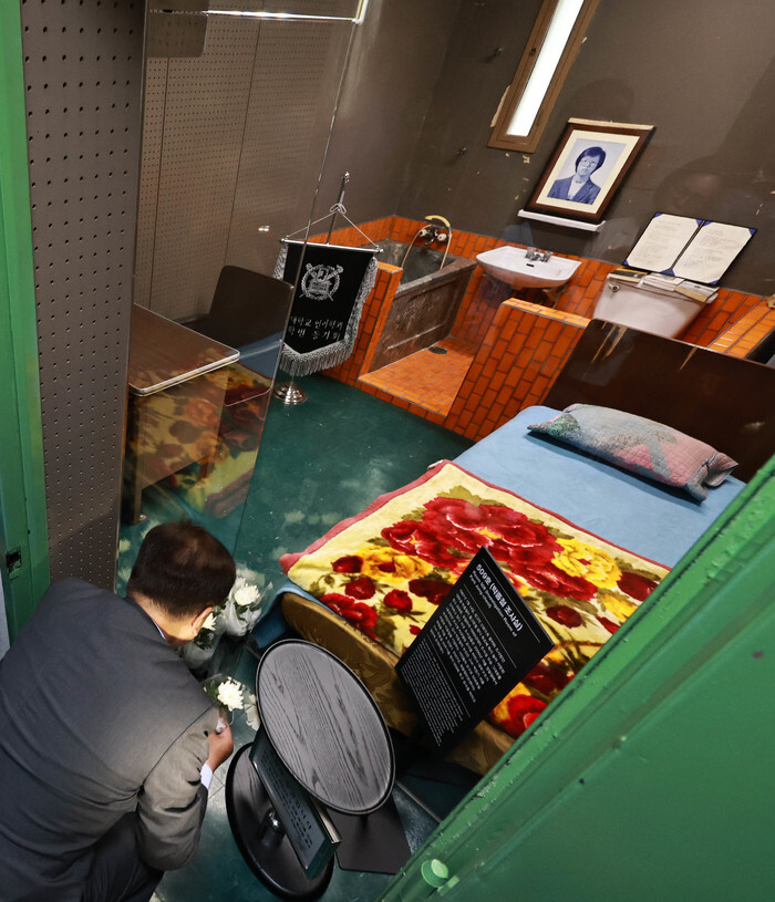 National Assembly Speaker Woo Won-shik offers a flower inside Room 509 at the now-defunct Anticommunist Office of the National Police Agency, a notorious symbol of state violence during the military dictatorship in the 1970s and 1980s, in which student activist Park Jong-chul was tortured to death, at the National Museum of Korea Democracy in Seoul on June 10, 2025, during a ceremony to mark the 38th anniversary of the June 10, 1987, democratization movement that led to the country's introduction of the direct presidential election system. The anticommunist office has been transformed into the museum. (Pool photo) (Yonhap)
