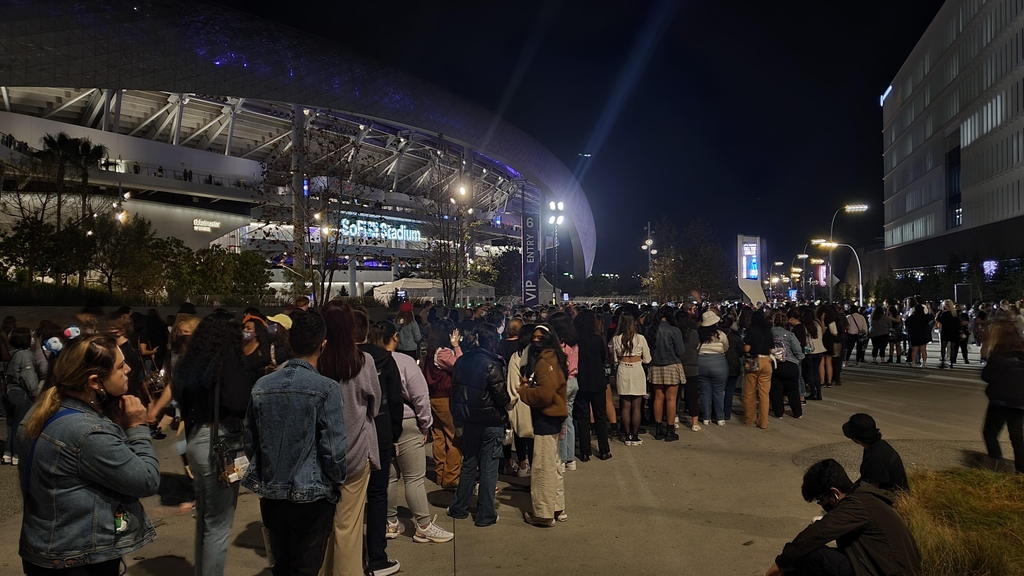 공연이 열린 소파이 스타디움 일대는 전날부터 팬들이 몰려들어 발 디딜 틈 없이 인산인해를 이뤘다. 티셔츠나 부채 등을 파는 굿즈 상점 앞에도 긴 줄이 등장해 물건을 손에 쥐기까지는 수 시간을 기다려야 할 정도였다.