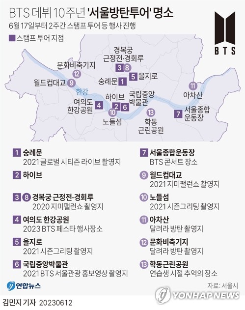 (서울=연합뉴스) 고은지 기자 = 서울시와 서울관광재단은 방탄소년단(BTS) 데뷔 10주년을 기념하는 'BTS 10th 애니버서리 페스타'를 맞아 BTS와 관련된 서울 시내 주요 명소 13곳을 안내하는 '서울방탄투어' 지도를 제작했다고 12일 밝혔다.