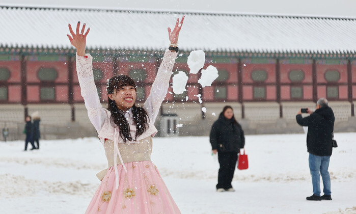 Enjoying heavy snowA tourist poses for a photo at Gyeongbok Palace in central Seoul on Jan. 5, 2025. (Yonhap)(END)