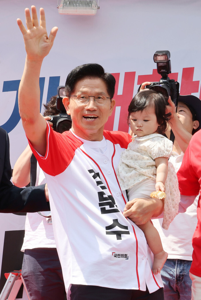 Kim Moon-soo, the presidential candidate of the People Power Party, waves while holding a baby during a campaign stop in Anseong, south of Seoul, on May 26, 2025, ahead of the June 3 presidential election. (Pool photo) (Yonhap)