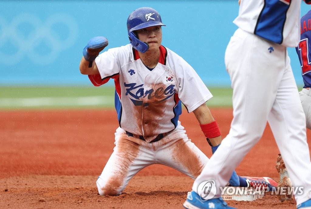 | ▲ In this file photo from Aug. 7, 2021, Park Hae-min of South Korea celebrates after stealing third base against the Dominican Republic during the bottom of the fifth inning of the bronze medal game at the Tokyo Olympic baseball tournament at Yokohama Stadium in Yokohama, Japan. (Yonhap) |
