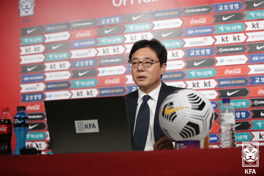 | ▲ Hwang Sun-hong, new head coach of the South Korean men's under-23 national football team, speaks at his inaugural press conference at the Korea Football Association (KFA) headquarters in Seoul on Sept. 16, 2021, in this photo provided by the KFA. (PHOTO NOT FOR SALE) (Yonhap) |