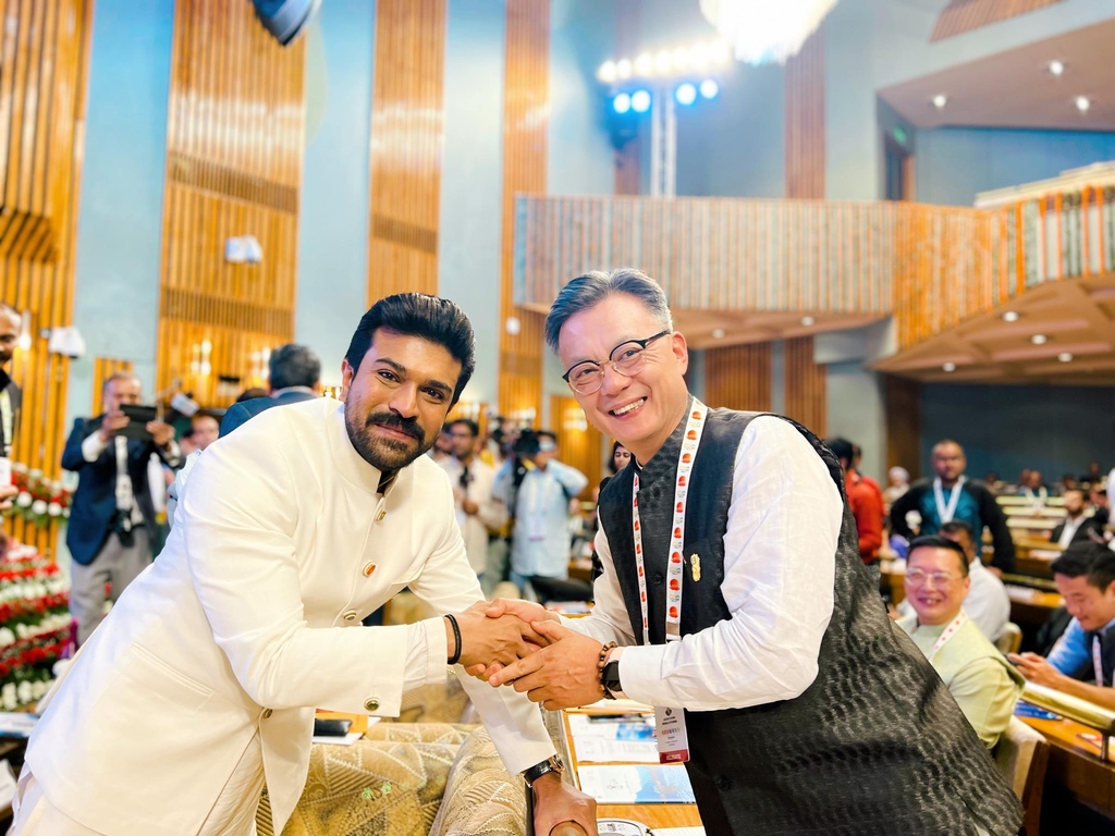 | ▲ 'RRR' 주연 배우와 장재복 주인도대사 (뉴델리=연합뉴스) 22일 인도 스리나가르에서 열린 주요 20개국(G20) 관광 실무단 회의에서 만난 인도 영화 'RRR'의 주연 배우 람 차란(왼쪽)과 장재복 주인도대사. [주인도한국대사관 제공ㆍ연합뉴스 자료사진. 재판매 및 DB 금지] |