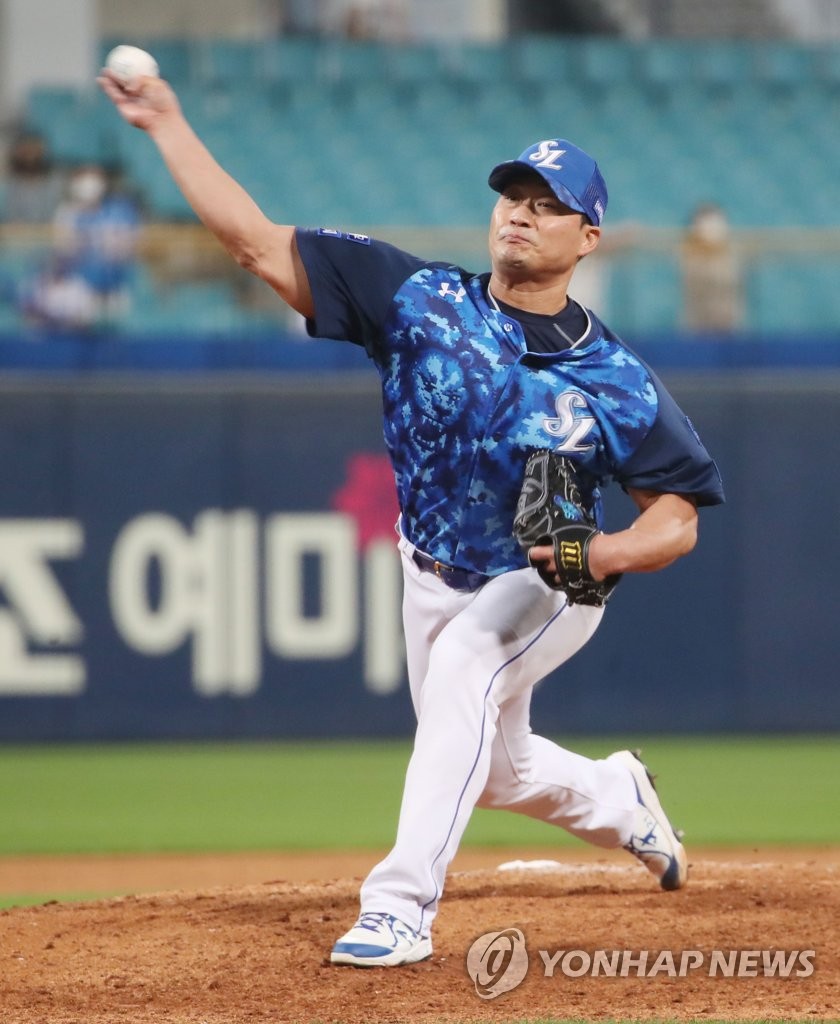 | ▲ Oh Seung-hwan of the Samsung Lions pitches against the NC Dinos in the top of the ninth inning of a Korea Baseball Organization regular season game at Daegu Samsung Lions Park in Daegu, 300 kilometers southeast of Seoul, on June 13, 2021. (Yonhap) |