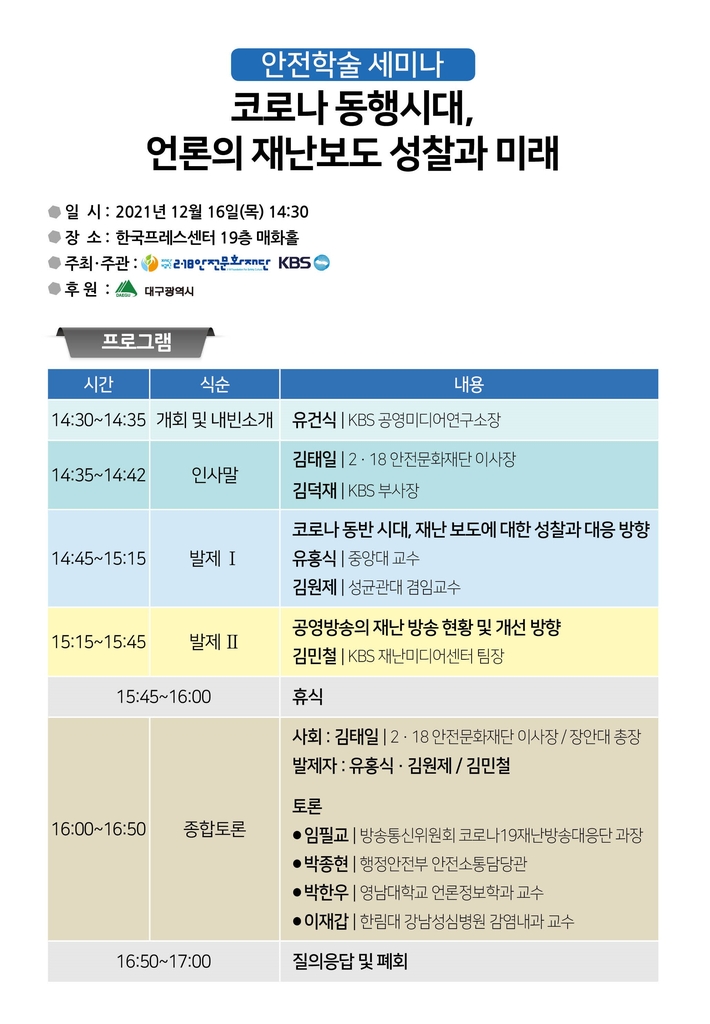 유홍식 중앙대 교수, 김원제 성균관대 겸임교수 등이 발제하며, 박종헌 행정안전부 안전소통담당관, 임필교 방송통신위원회 코로나19재난방송대응단 과장 등이 토론자로 참여한다.