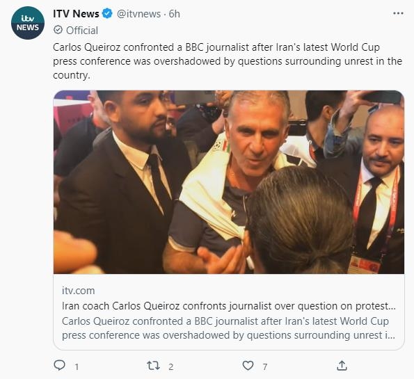 | ▲ 이란 반정부 시위에 관해 질문한 BBC 기자에게 항의하는 케이로스 이란 감독 [영국 ITV 트위터 캡처. 재판매 및 DB금지] |