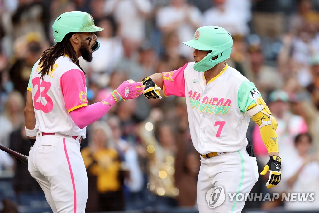 | ▲ 1회 선두 타자 홈런 후 페르난도 타티스 주니어의 축하 받는 김하성 [게티이미지/AFP=연합뉴스] |