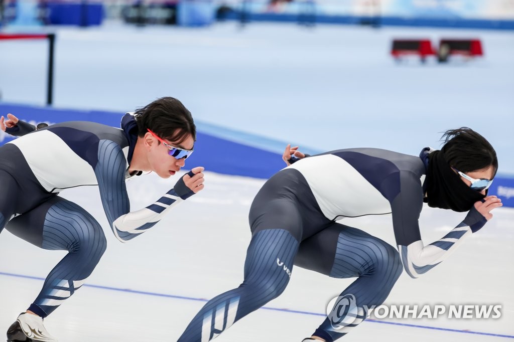| ▲ South Korean speed skaters Park Seong-hyeon (R) and Kim Min-seok train at the National Speed Skating Oval in Beijing on Feb. 2, 2022, in preparation for the Beijing Winter Olympics. (Yonhap) |