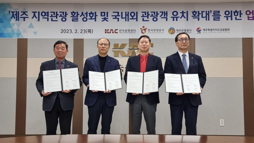 한국관광공사, 한국공항공사, 제주관광공사, 제주도관광협회는 23일 제주국제공항에서 '제주 관광 활성화 및 국내·외 관광객 유치 확대를 위한 업무협약'을 체결했다.