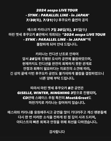 소속사 SM엔터테인먼트는 30일 "카리나는 현재까지도 컨디션을 완전히 회복하지 못한 관계로 안정과 회복이 필요하다는 의료진의 소견을 받았다"며 "긴 상의 끝에 이번 후쿠오카 공연도 불가피하게 불참을 결정했다"고 밝혔다.