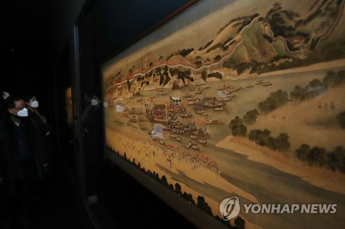 | ▲ 국립중앙박물관에서 만나는 평안감사향연도 (서울=연합뉴스) 진연수 기자 = 23일 서울 용산구 국립중앙박물관에서 열린 특별전 '한겨울 지나 봄 오듯-세한(歲寒)·평안(平安)'에서 참석자들이 평안감사향연도 중 월야선유도를 살펴보고 있다. 추사 김정희의 '세한도'와 단원 김홍도의 작품으로 전하는 '평안감사향연도'를 포함해 총 18점을 만날 수 있는 이번 전시는 오는 24일부터 내년 1월 31일까지 열린다. 2020.11.23 jin90@yna.co.kr |