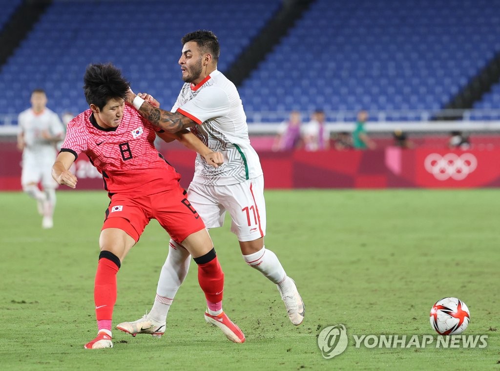 | ▲  In this file photo from July 31, 2021, Lee Kang-in of South Korea (L) battles Alexis Vega of Mexico during the quarterfinals of the Tokyo Olympic men's football tournament at International Stadium Yokohama in Yokohama, Japan. (Yonhap) |