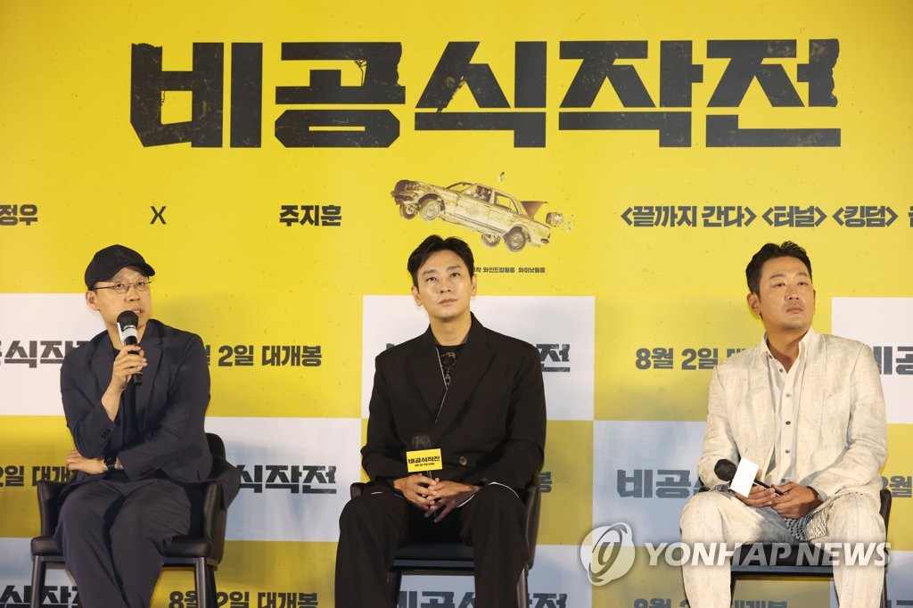 | ▲ 영화 '비공식작전' 제작보고회 (서울=연합뉴스) 강민지 기자 = 4일 오전 서울 용산구 CGV 용산아이파크몰에서 영화 '비공식작전'제작보고회가 열리고 있다. 왼쪽부터 김성훈 감독, 배우 주지훈, 하정우. 2023.7.4 mjkang@yna.co.kr |