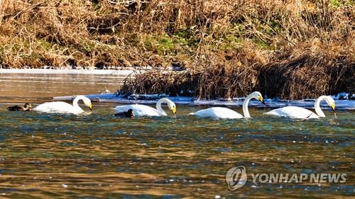 (옥천=연합뉴스) 충북 옥천의 금강을 찾은 겨울 진객 큰고니떼가 장관을 이루고 있다.