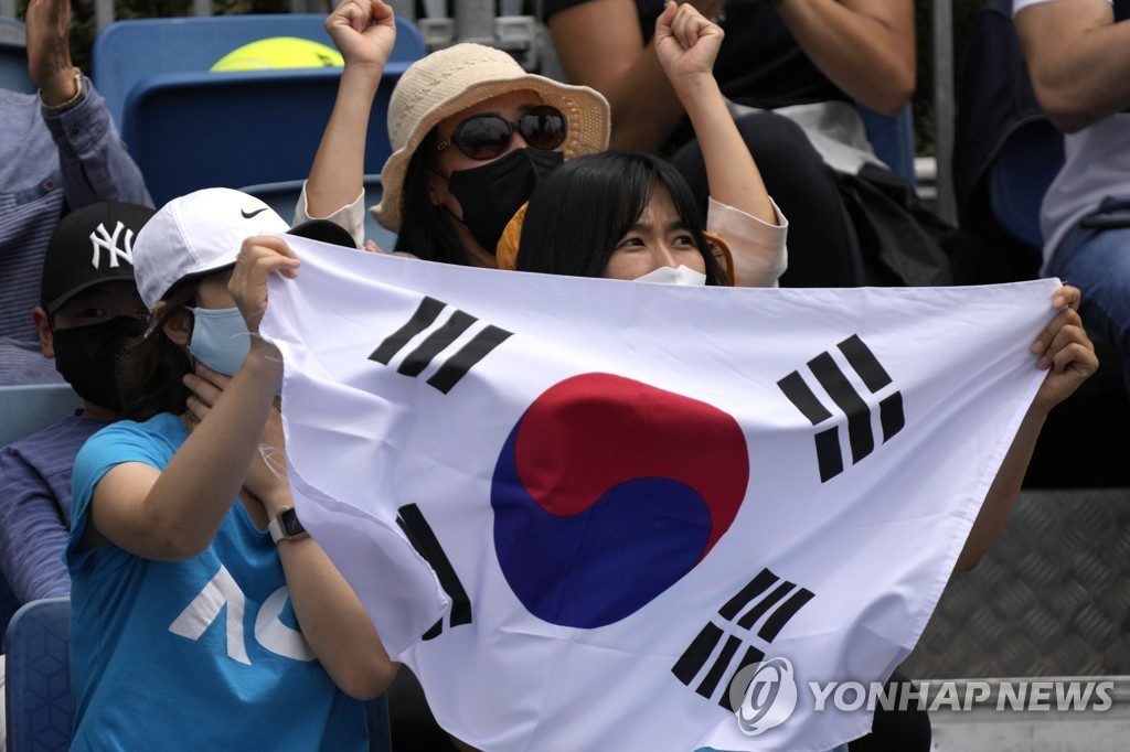 ▲ In this Associated Press photo, fans of South Korean tennis player Kwon Soon-woo hold up their national flag, Taegeukgi, during Kwon's first round men's singles match against Holger Rune of Denmark at the Australian Open in Melbourne on Jan. 17, 2022. (Yonhap)