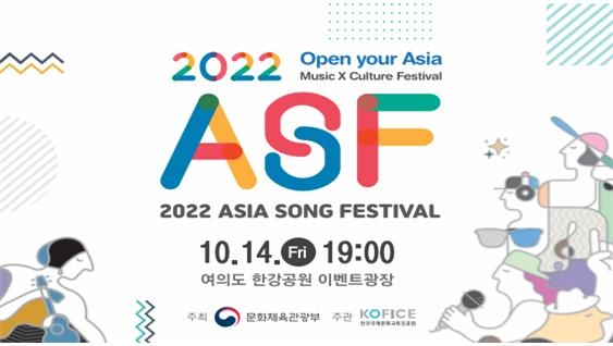 (서울=연합뉴스) 이태수 기자 = 한국국제문화교류진흥원은 오는 14∼16일 서울 여의도 한강공원 이벤트광장에서 '2022 아시아송 페스티벌 X 문화잇지오'를 연다고 12일 밝혔다.