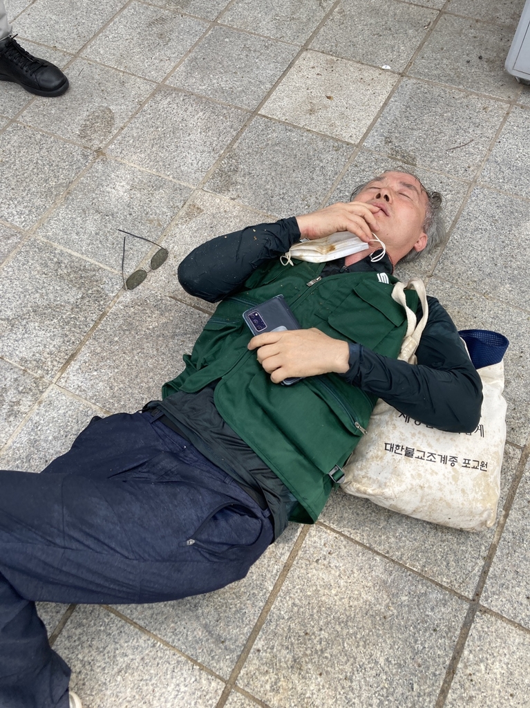 | ▲ 오물 뒤집어쓰고 폭행당해 쓰러진 피해자 (서울=연합뉴스) 양정우 기자 = 14일 서울 강남의 유명 사찰인 봉은사 앞에서 자승 전 총무원장 측의 조계종 총무원장 선거 개입 등을 비판하는 1인 시위를 준비하던 조계종 노조원이 스님들로부터 폭행을 당하는 일이 벌어졌다. 사진은 인분으로 추정되는 오물을 뒤집어쓰고 폭행당해 쓰러진 조계종 노조 박정규 기획홍보부장. 2022.8.14 eddie!yna.co.kr [조계종 노조 제공 영상 캡처] (끝) |