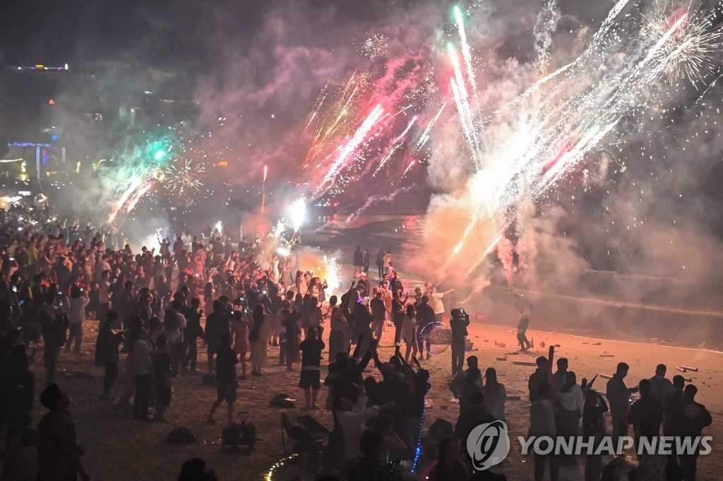 | ▲ 중국 새해맞이 폭죽 (하이난 AFP=연합뉴스) 2022년 12월 31일 하이난성의 해변에서 시민들이 폭죽을 터뜨리며 새해를 맞이 하고 있다. |