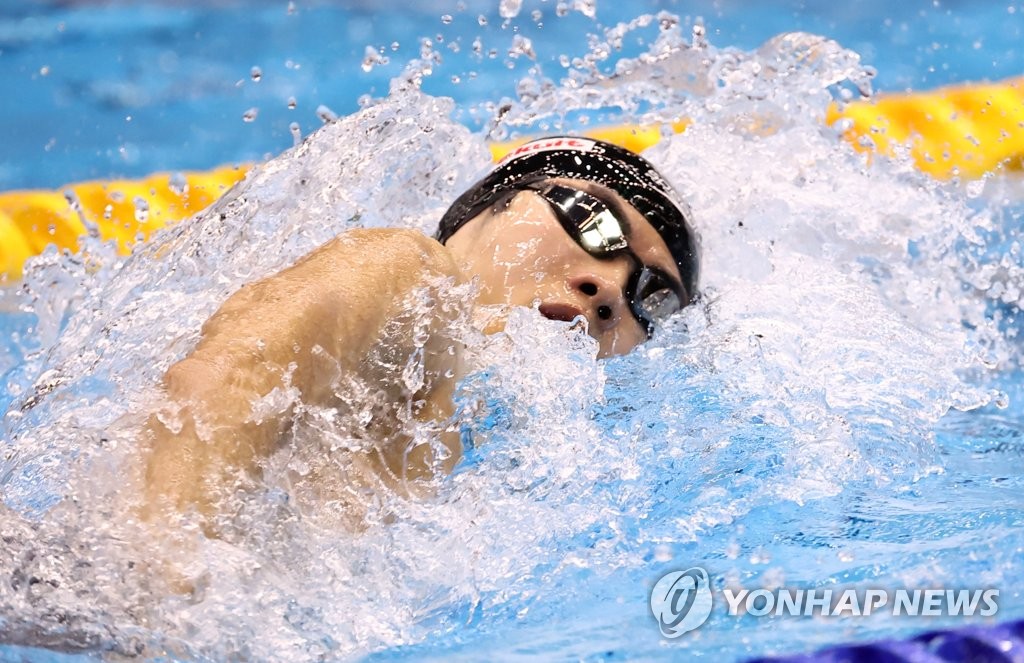 | ▲ Hwang Sun-woo of South Korea competes in the heats for the men's 4x200-meter freestyle relay at the World Aquatics Championships at Marine Messe Fukuoka Hall A in Fukuoka, Japan, on July 28, 2023. (Yonhap) |