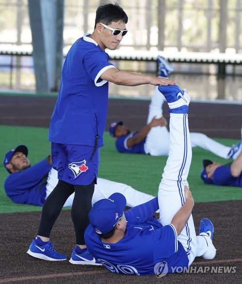 | ▲ 스트레칭하는 류현진 메이저리그 토론토 블루제이스의 류현진이 2월 15일(현지시간) 미국 플로리다주 더니든 TD 볼파크 인근 훈련장에서 열린 스프링캠프에 참가해 김병곤 트레이닝 코치의 도움을 받으며 스트레칭을 하고 있다. [연합뉴스 자료사진] |