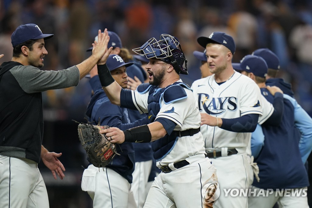 | ▲ In this Associated Press photo, members of the Tampa Bay Rays celebrate their 5-0 victory over the Boston Red Sox in Game 1 of the American League Division Series at Tropicana Field in St. Petersburg, Florida, on Oct. 7, 2021. (Yonhap) |