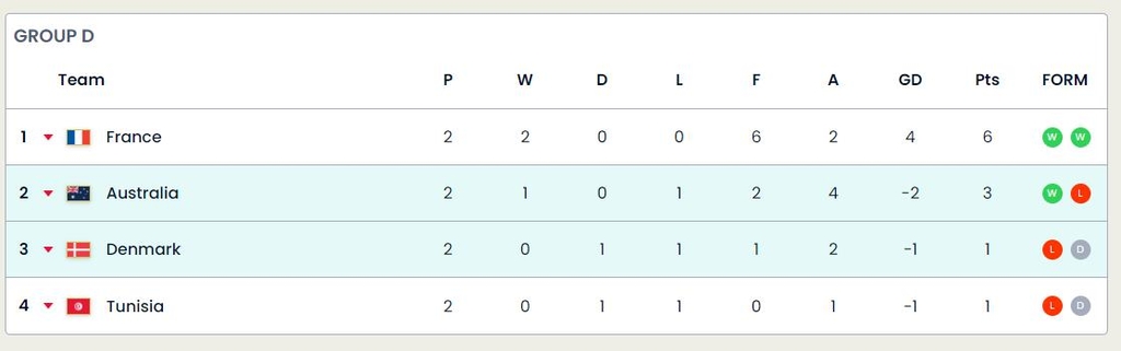 | ▲ 2022 카타르 월드컵 D조 중간순위(29일 현재) [FIFA 홈페이지 캡처. 재판매 및 DB 금지] |