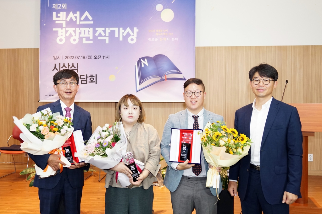 | ▲ 제2회 '넥서스 경장편 작가상' 수상자들 왼쪽부터 권석, 한요나, 권제훈 작가 및 임상진 넥서스 대표이사. [넥서스 제공. 재판매 및 DB 금지] |