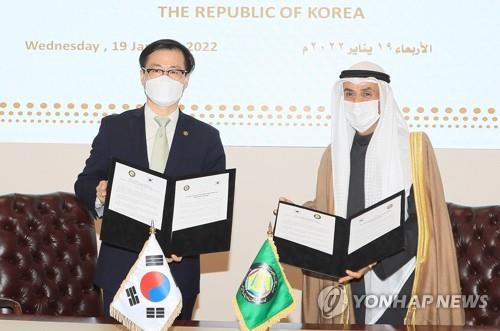 | ▲ This file photo, provided by South Korea's trade ministry, shows Trade Minister Yeo Han-koo (L) and the Gulf Cooperation Council's Secretary-General Nayef Falah M. Al-Hajraf posing for a photo after their agreement to resume talks for a free trade agreement in Riyadh on Jan. 19, 2022. (PHOTO NOT FOR SALE) (Yonhap) |