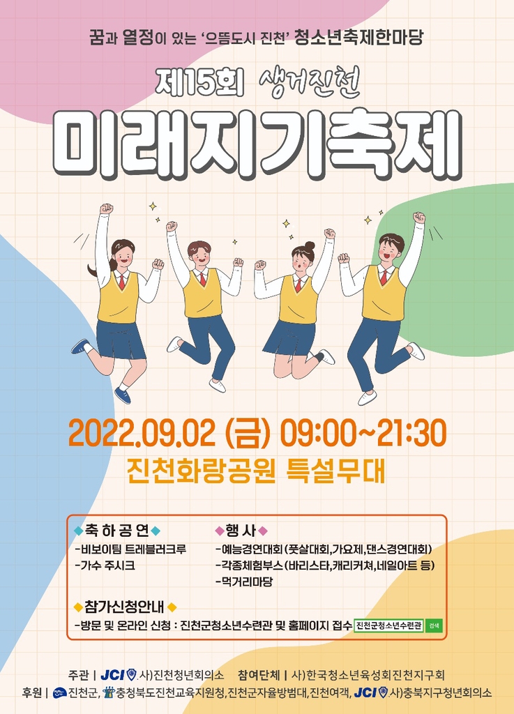 진천청년회의소(회장 유정화)가 주최·주관하고 한국청소년육성회 진천지구회(회장 권순성)가 함께 하는 이 축제는 신종 코로나바이러스 감염증(코로나19) 확산으로 지난 2년간 열지 못했다.