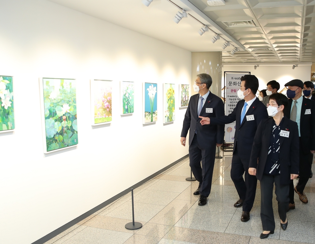 | ▲ 오픈 갤러리 살피는 박재현 수자원공사 사장(왼쪽부터)과 허태정 대전시장 [한국수자원공사 제공. 재판매 및 DB 금지] |