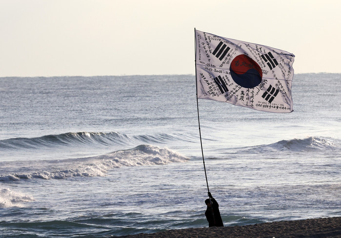 National flag in east sea A man waves the national flag, the Taegeukgi, at Gyeongpo Beach in Gangneung, Gangwon Province, on Jan. 1, 2026, to show support for the country. (Yonhap)(END)