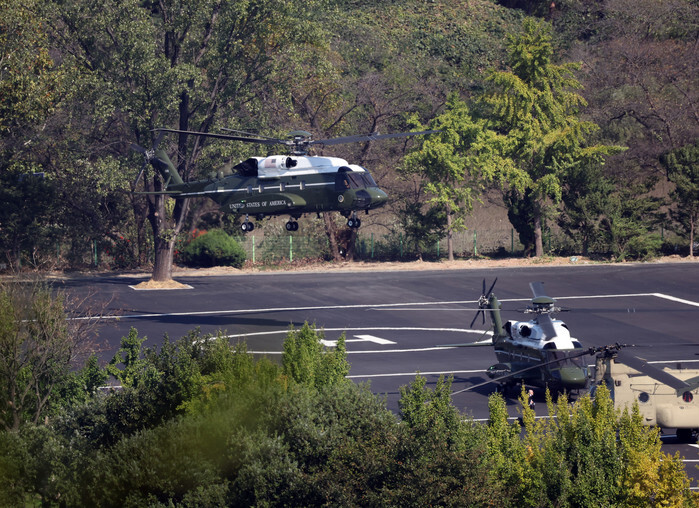 Marine One, carrying U.S. President Donald Trump, lands at a heliport in Gyeongju, North Gyeongsang Province, southeastern South Korea, on Oct. 29, 2025, as he travels to the Gyeongju Arts Center to take part in the CEO Summit of the Asia-Pacific Economic Cooperation forum. (Yonhap)